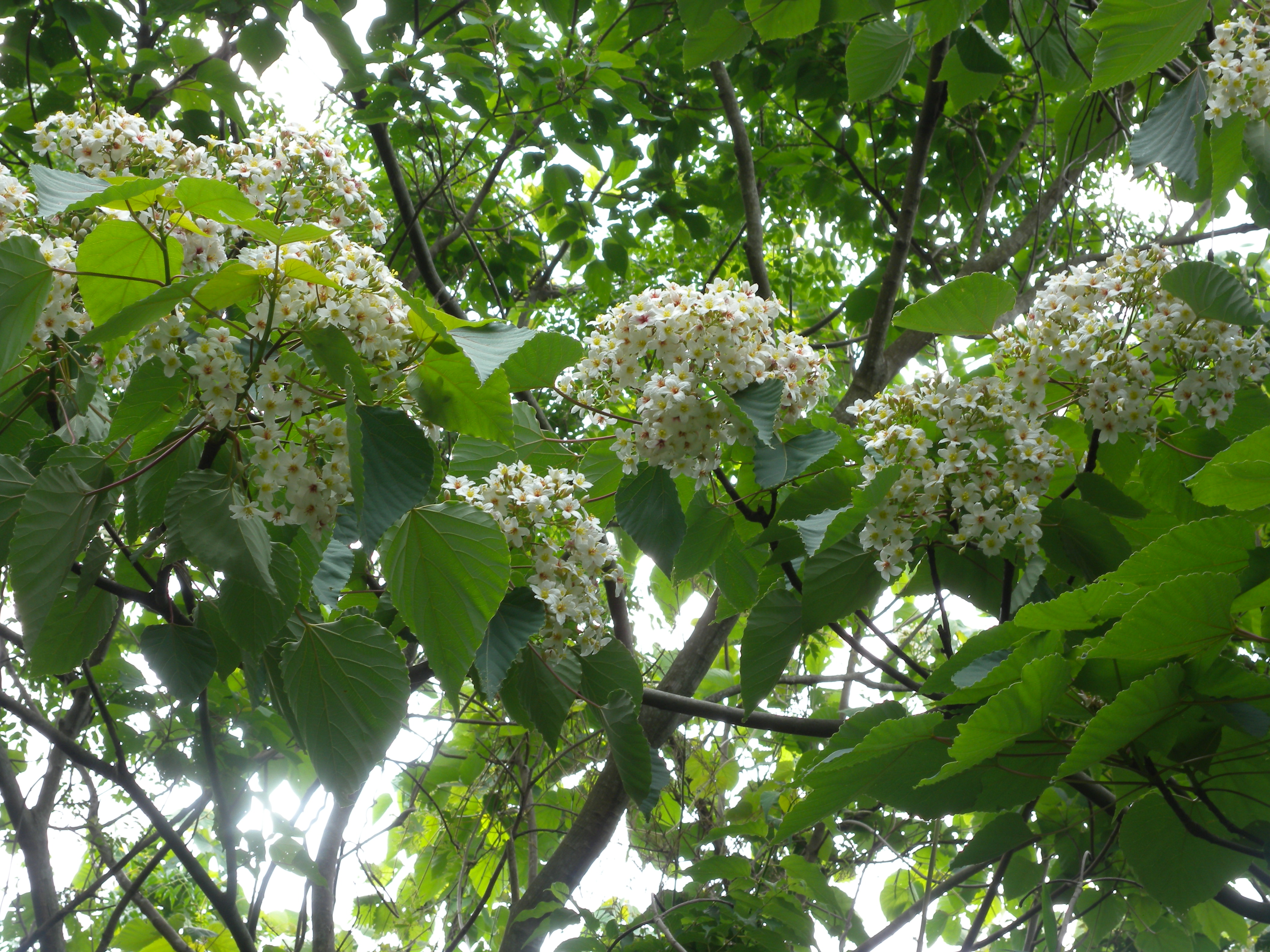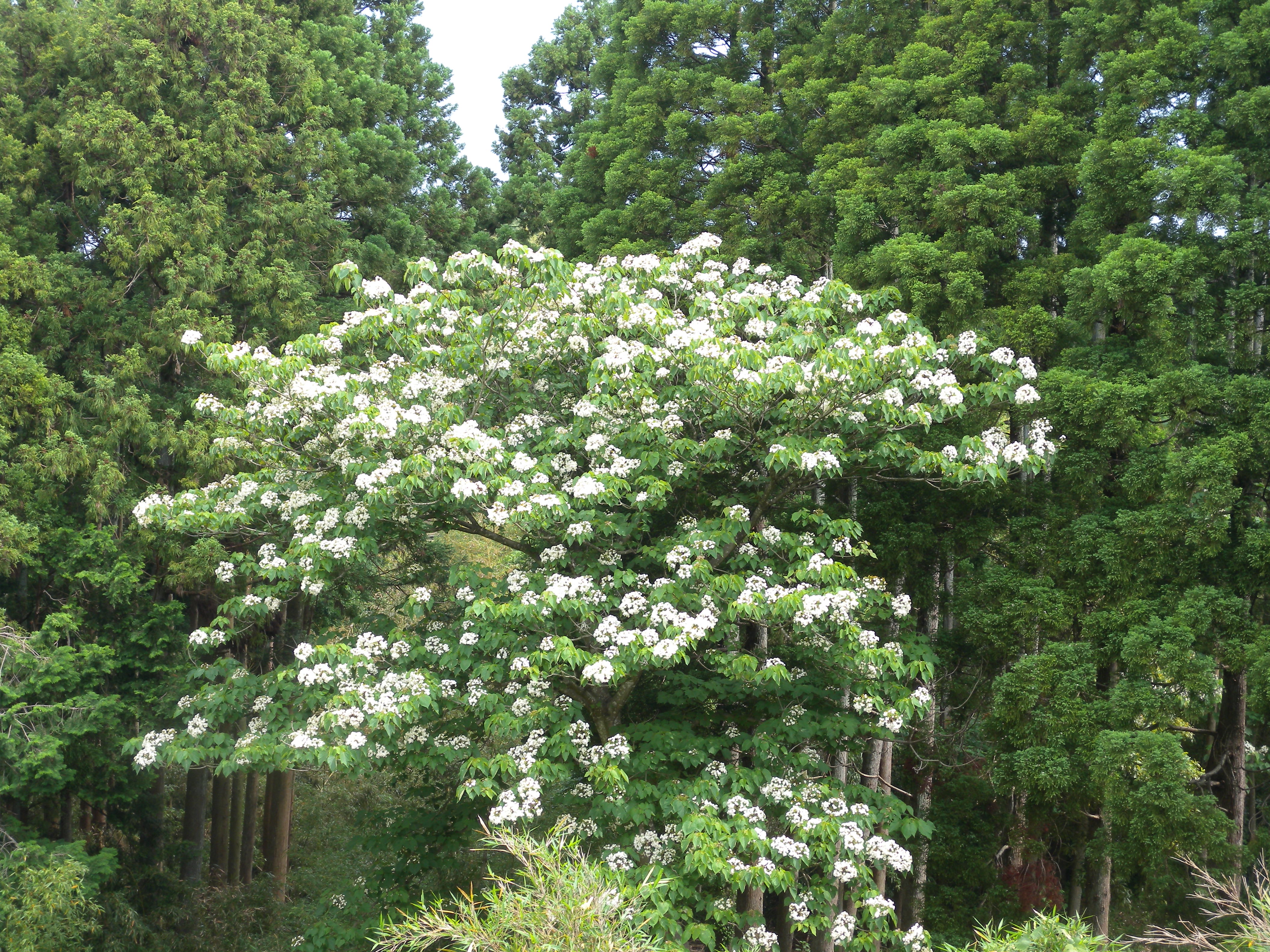 樹木葬霊園の駐車場から白い花が見えます。杉の木に囲まれた緑の中に咲いているのでとても目立ちます。アブラギリと言います。植物図鑑によると種子から油を採取するため、昔、中国から持ち込まれた植物のようですが、私が子供のころから山に自生していましたので日本の固有種と思っていました。
