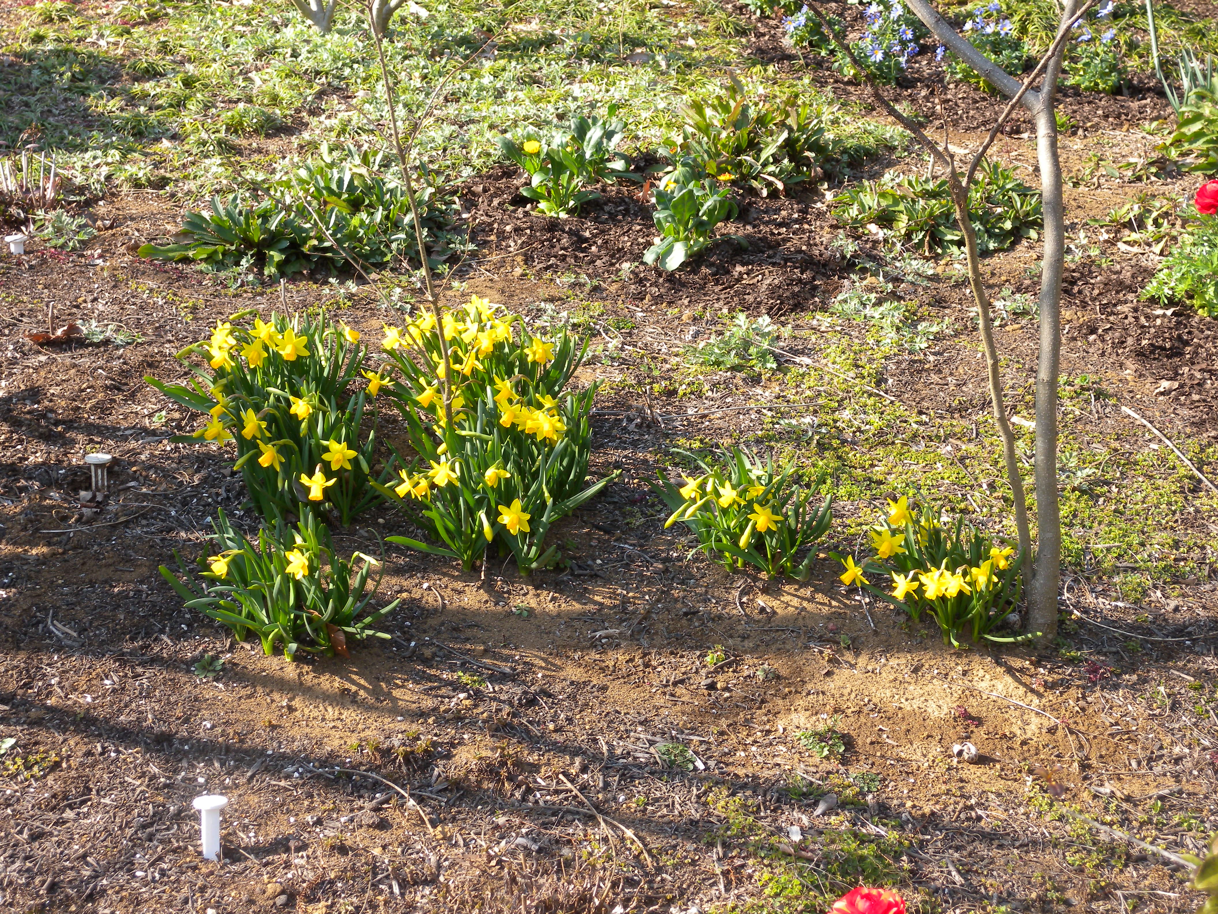 だんだんと暖かくなって、区画内に植えられた花もにぎやかになってきました。黄色のスイセンが所々に咲いています。小さなスイセンですが、集まって咲いているととても目立ちます。
