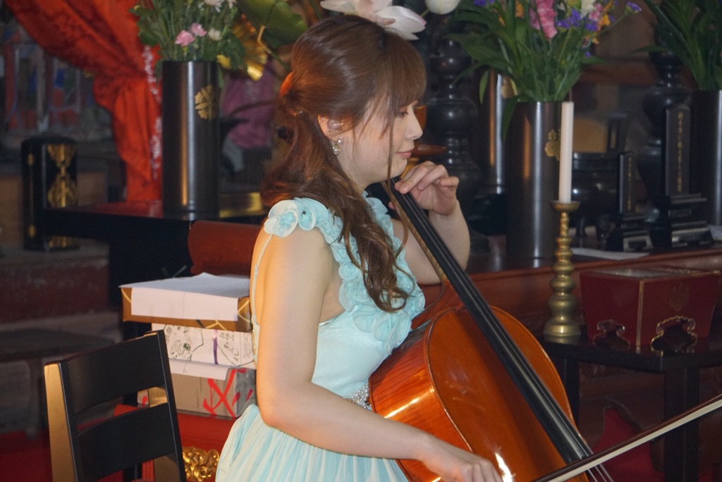 今回は丁度良い陽気で、霊園の新緑と花が美しかったと思います。読経後のコンサートでは、ピアノ(中村理恵さん)、バイオリン(渡邉麻衣さん)、チェロ(町田奈津実さん)を演奏していただきました。私はお墓の前で渡邉さんが弾いたバイオリンに心が揺れましたが、本当に音楽を聴いて心が震えたのはその時が初めてです。