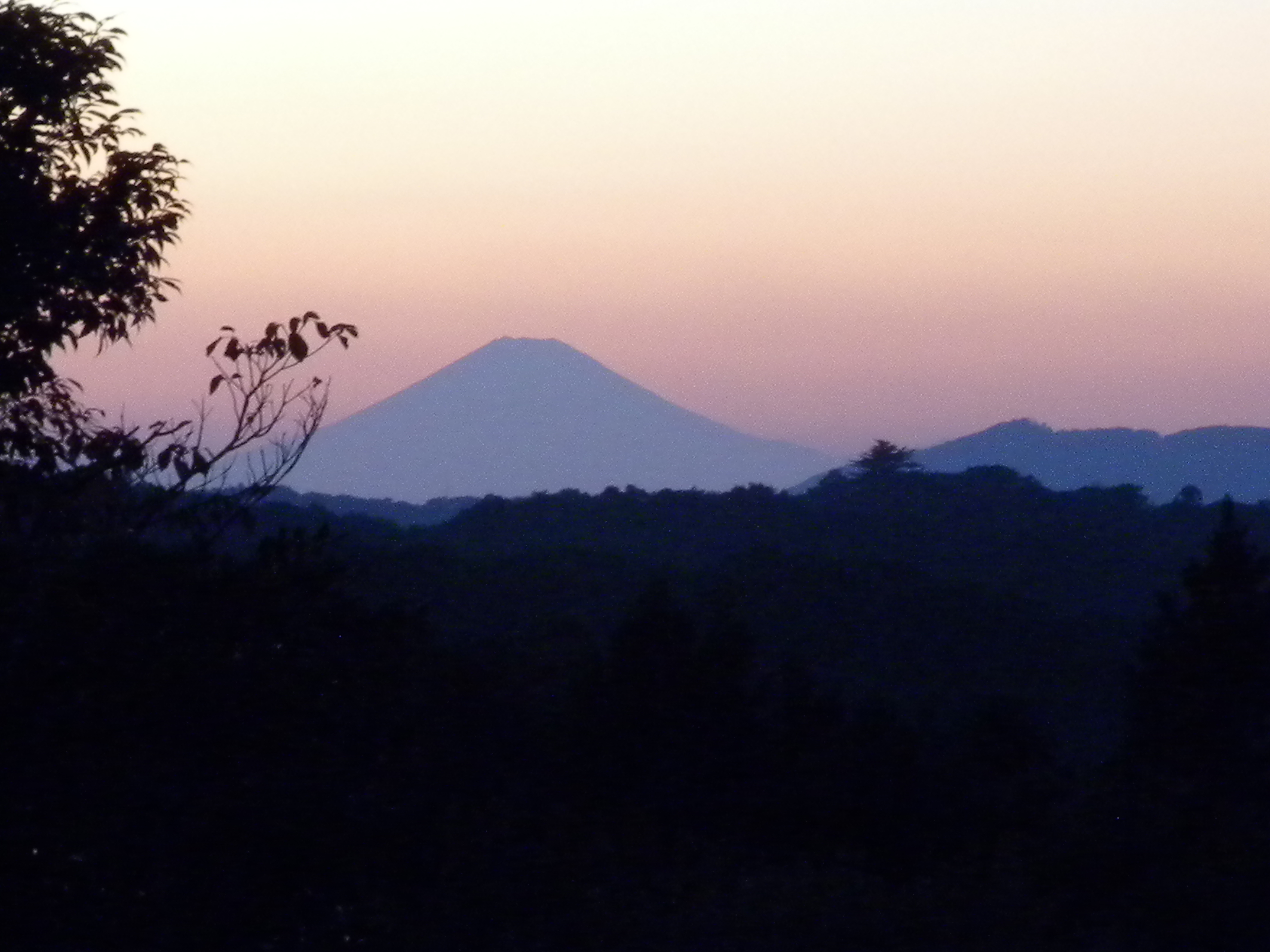 日が暮れる時間が早くなって現在午後5時ですが、霊園内は薄暗いです。日中に見える頂上に雪のある青い富士山も美しいですが、夕暮れ時の夕日越しに見えるシルエットもなかなか綺麗です。