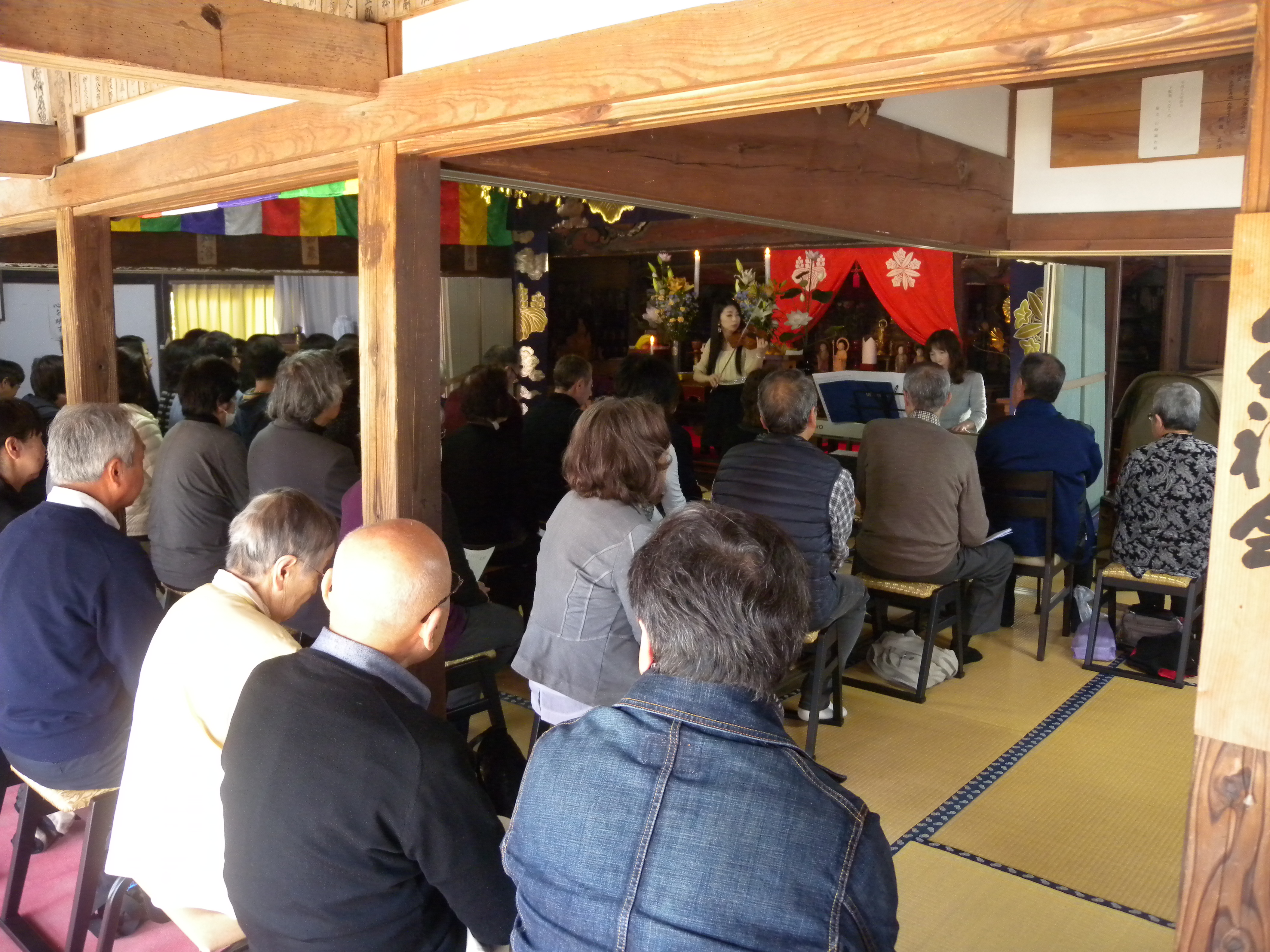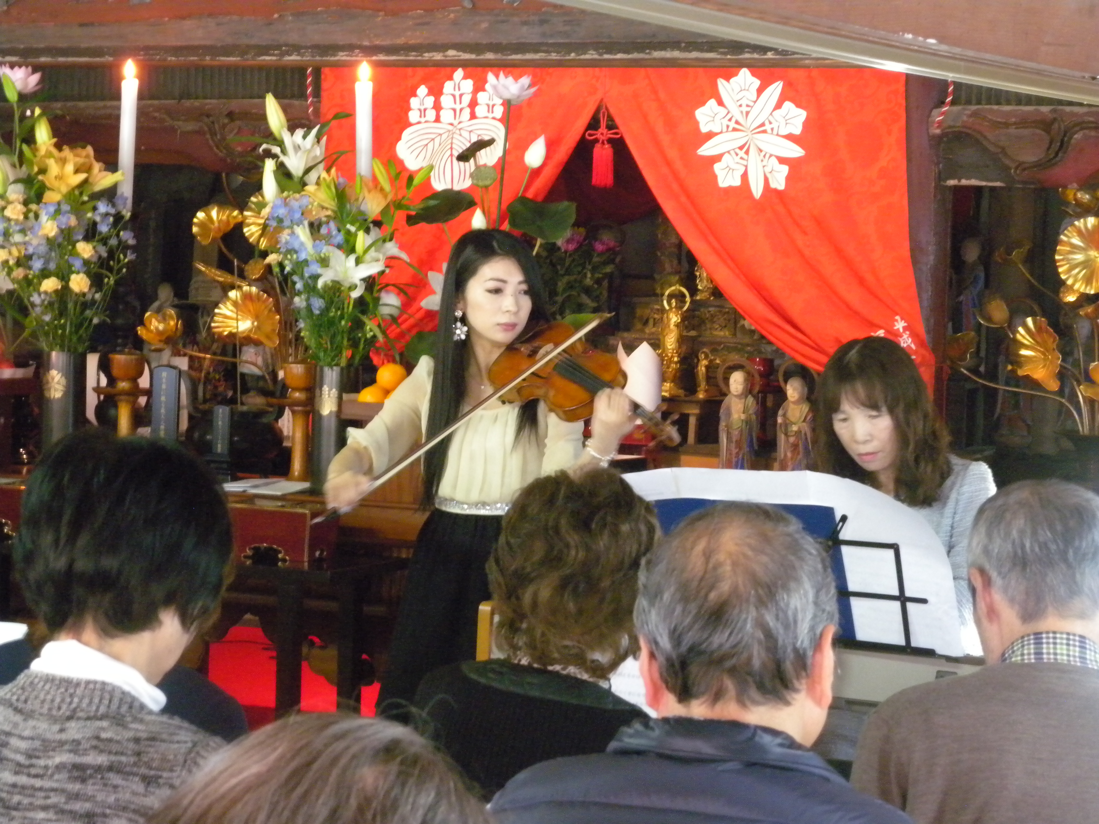 3月20日お彼岸の中日に合同供養会を行いました。ご参加いただいた方々には心より感謝いたします。また、3連休のため道路が渋滞し開始時間が遅れましたことお詫び致します。参加された方は、渡邉麻衣さんのバイオリンと渡邉康江さんのピアノに心が洗われたことと思います。私自身も麻衣さんのバイオリンに出会えたことに感謝しています。