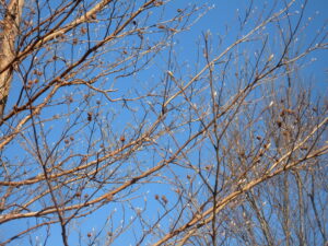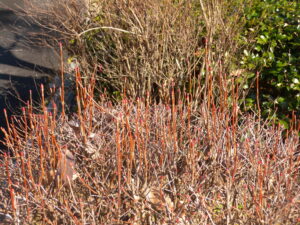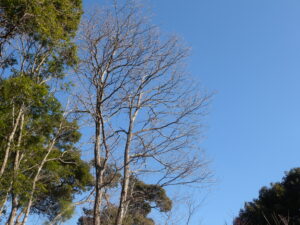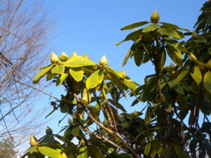 園内の落葉樹のほとんどは葉を落として冬の姿となりました。ただ、近くで見ると来年の花芽や葉の芽がしっかりと付いています。赤っぽい木肌の先端に白の芽があるのは、ヒメシャラの芽です。剪定後に伸びた枝の先端に赤い芽があるのは、ドウダンツツジの物です。また、シャクナゲには、大きな花芽が付いています。植物たちは、来年の春に向けてしっかりと準備しています。