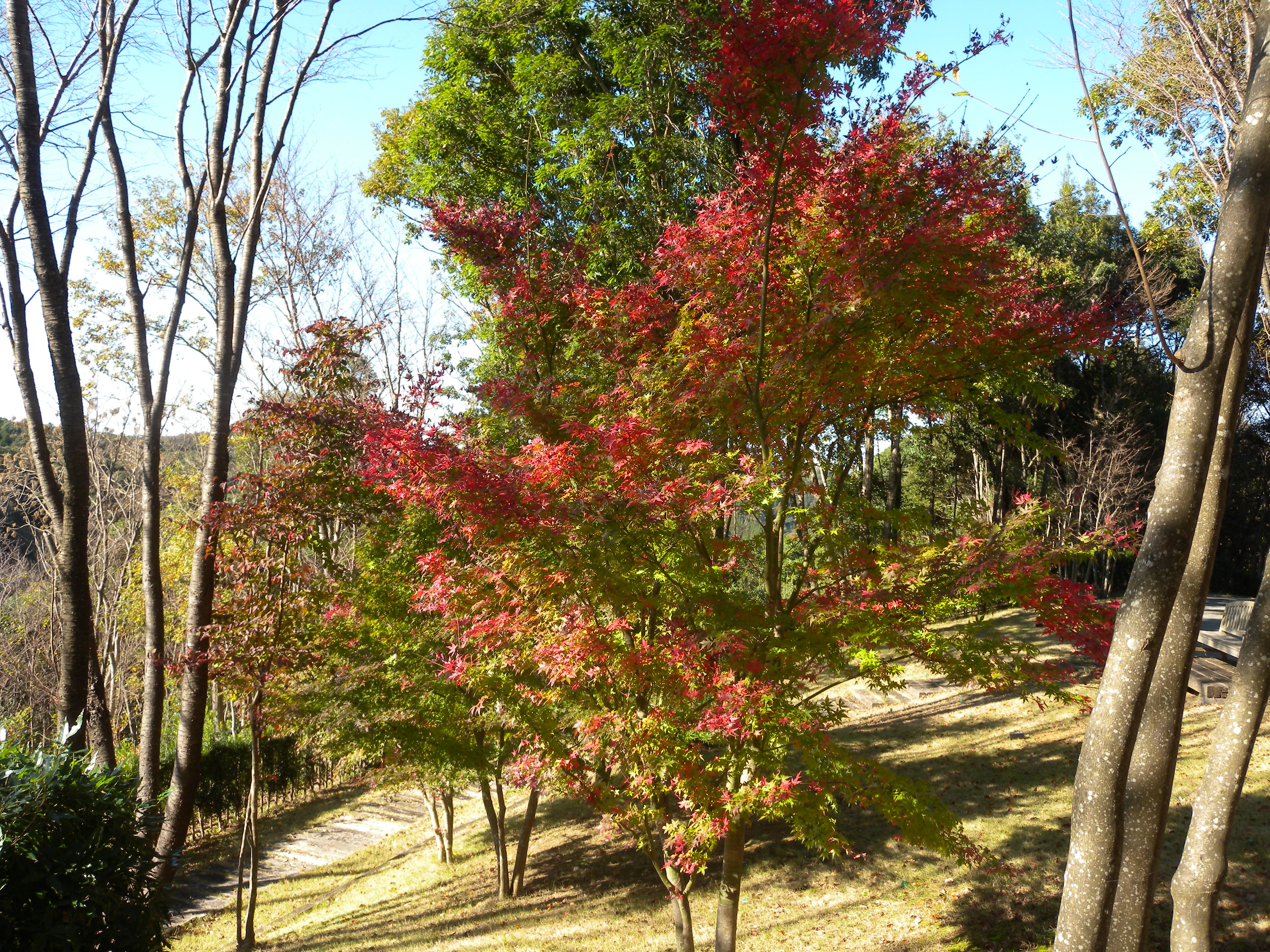 ここ数日、秋の終わりらしくないような暖かな日が続いています。随分と紅葉も鮮やかになってきましたが、強い風が吹くとすぐに散ってしまい、園内は落ち葉に覆われ始めました。ナンキンハゼやヤマボウシが赤や黄色に色付きましたが、昨日の風で落葉してしまいました。ただ今年は去年のような台風がこなかったので、モミジの葉は美しく色付いています。
