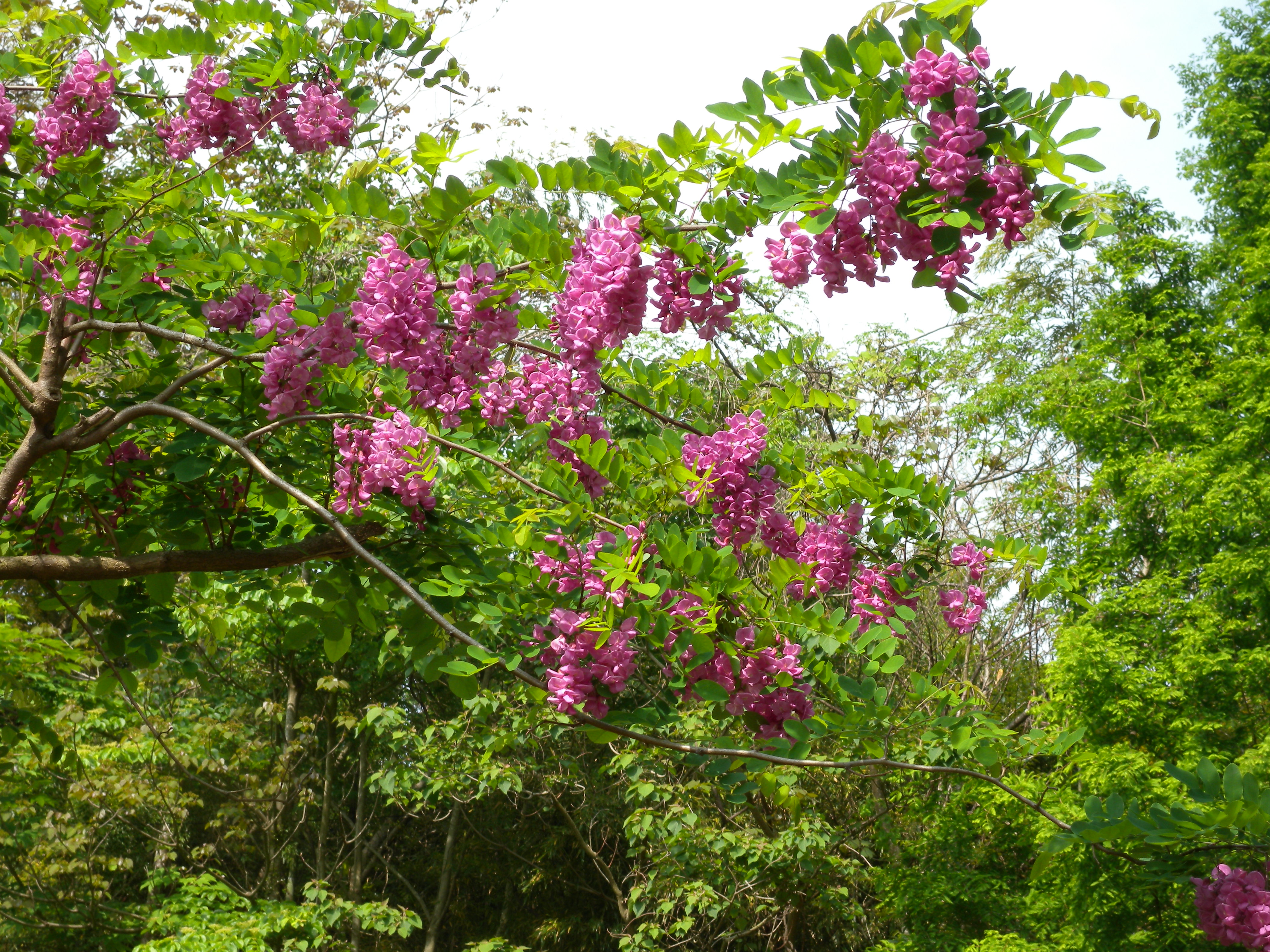 まるで、ブドウの房のような花はとても綺麗です。成長が早く根が枝葉の成長に追いつかない様子で大風が吹くと倒れてしまうのが難点です。