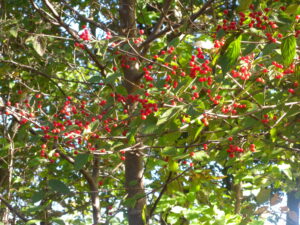 霊園内で現在、目を引く花はツワブキの黄色の花です。どんどん増えて園内のいたるところで咲いています。私は、この花が咲くと冬が近いような気がしてきます。また、自生している木の実も赤い色の実は目を引きます。写真は自生しているガマズミの実です。もう少しすると鳥たちに食べられてしまうと思います。最近は、夏が長くて秋を感じる期間が非常に短いように思いますが、里山の中で小さな秋を見つけて自分なりに楽しみたいと思います。