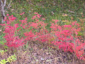 里山の紅葉はまだですが、ドウダンツツジは、真っ赤に紅葉しています。苗木をまとめて寄せてあるものですが、たまたま、日の差しかげんが紅葉する条件に合っていたのだと思います。