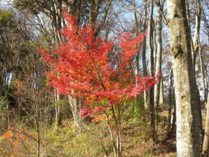 霊園内は、ここ何回か強風の日があったので、落葉樹の多くが葉を落としました。まだ、数本のモミジの紅葉が残っており、とても目立ちます。けっこうな頻度で落ち葉を片付けていますが、きりがないので大変です。