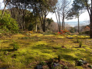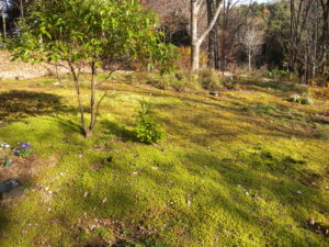 里山全体には常緑樹も沢山あるので、少しは緑を感じる事ができますが、地面の植物はほとんど枯れてしまい冬の姿です。そんな時でもコケだけは緑のままなので、園内にあるコケの多くある区画はとても綺麗です。コケについては好き嫌いがあって、人によってははがしてしまう人もいますが、私は人工的な園芸品種の花を植えるよりもコケむした感じの区画の方が断然に良いと思うのですが。