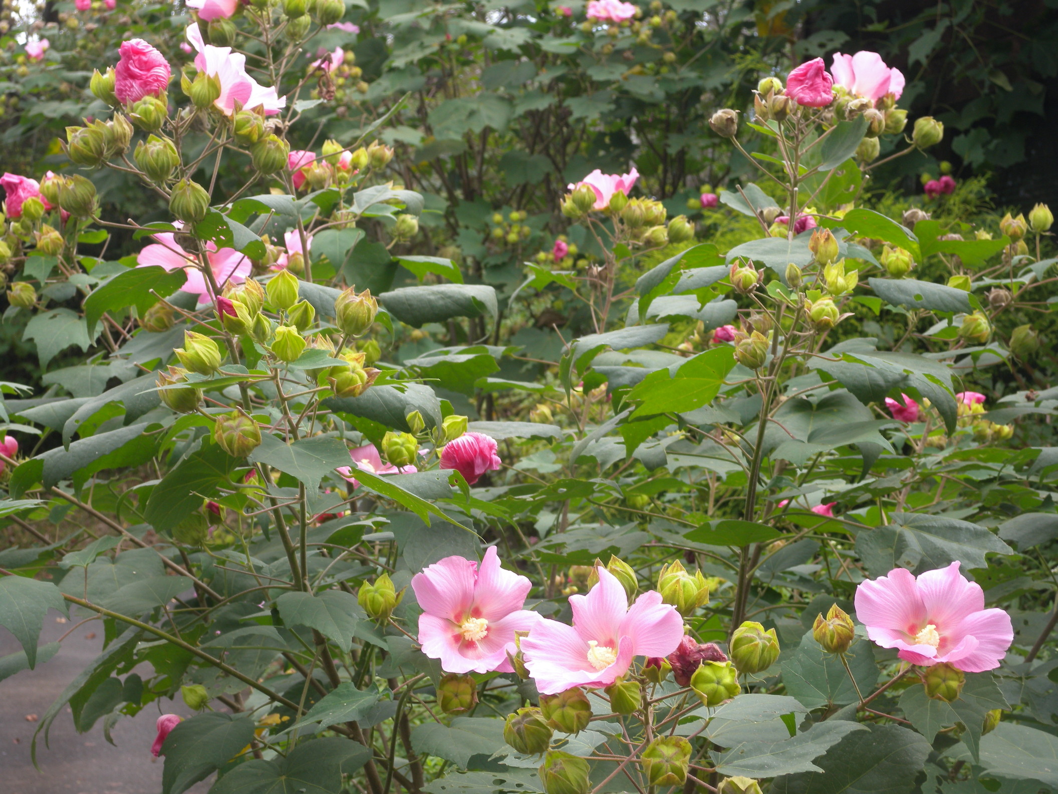 10月になりましたが、日中は汗ばむような陽気でまだ夏のようです。天気予報によるとまたしばらく雨の日が続いて徐々に気温が下がって秋の陽気になるとのことです。やっと気温が下がって秋らしくなるようです。ただ、普通は台風でも来ない限り秋空の天気の日が続くはずですが、どうも雨の日が多いようです。園内には自生の萩の花が沢山咲いて、キンモクセイの良い香りもして秋を感じるのですが、まだ、フヨウが満開で半部は夏のような気がします。